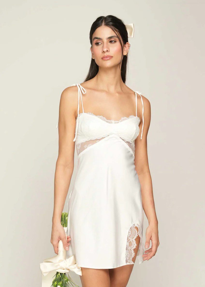 El Babydoll Diamonds confeccionado en un tono blanco marfil con amarres largos en los hombros que se transforman en lazos elegantes.