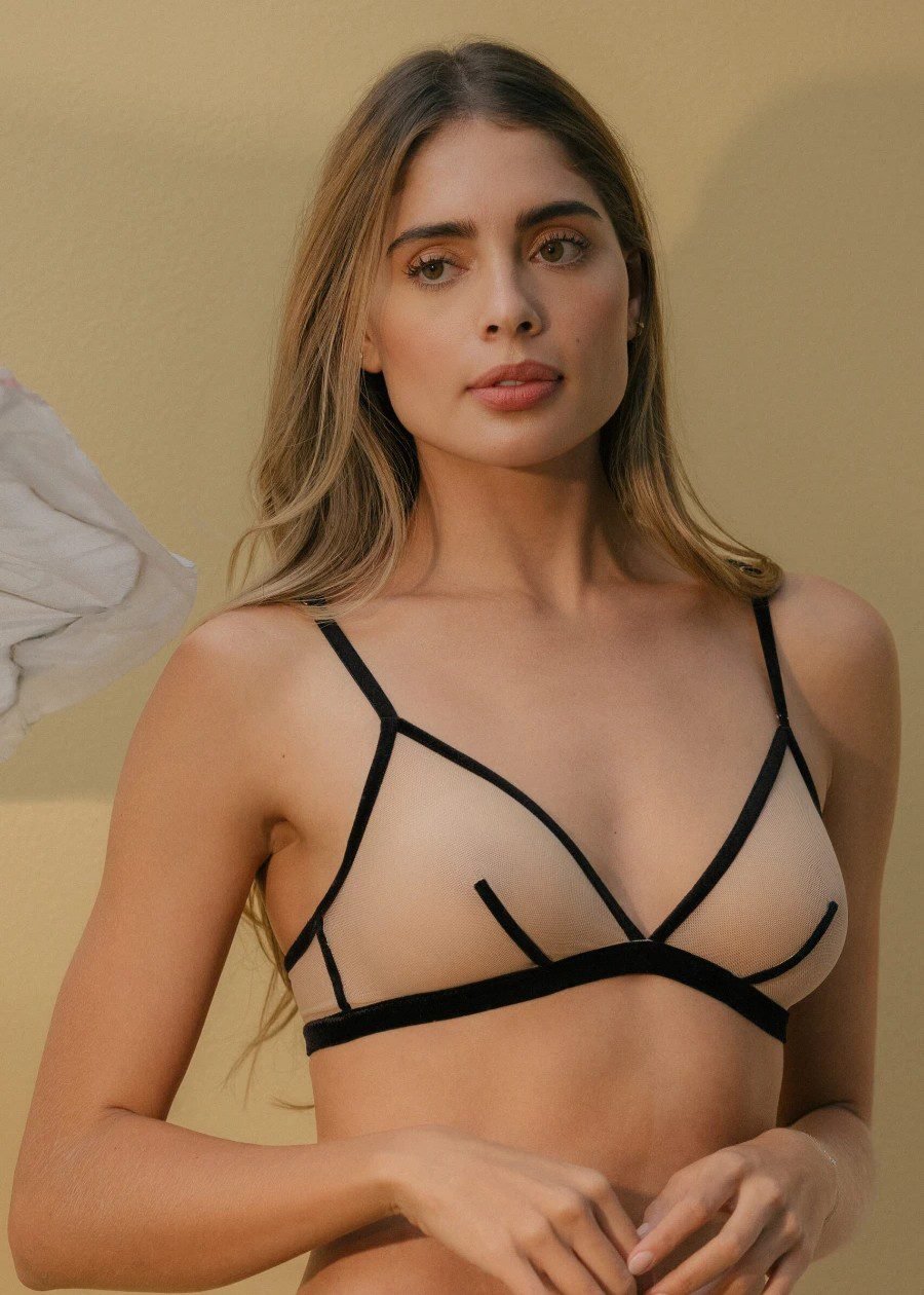 Bralette elaborado en delicado tul europeo. El escote y los sesgos son de terciopelo en color negro. Sus cargaderas son graduables y contrastan con tul que se fundirá en tu piel.