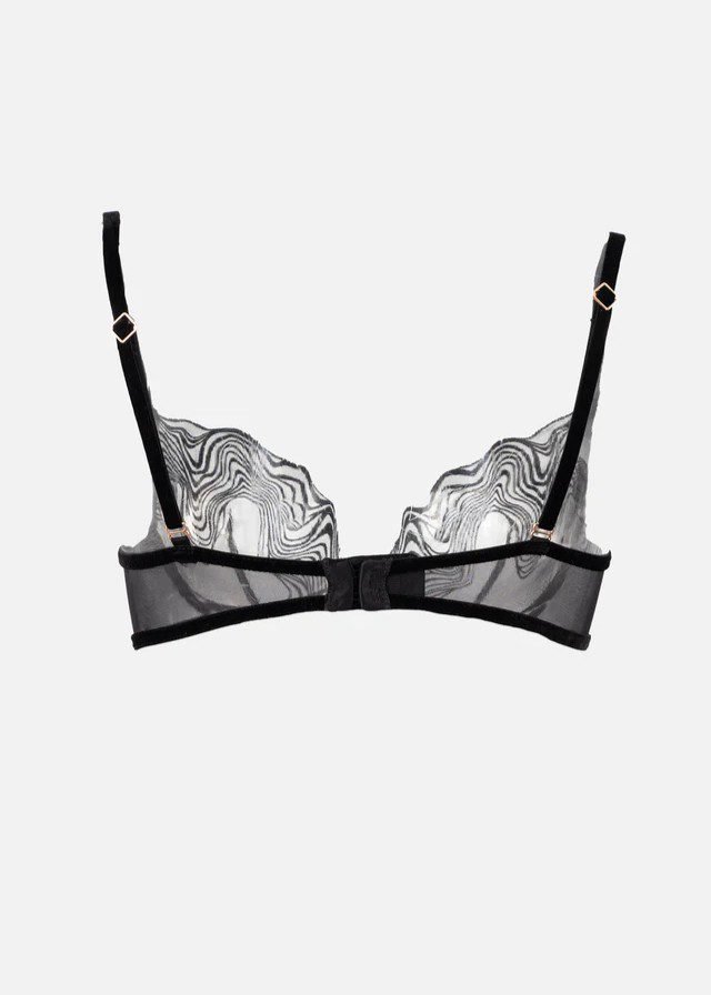 Este brasier esculpe con delicadeza y revela con intención. Confeccionado en lujoso encaje aterciopelado, en tul bordado con ondas que fluyen como tu energía, su estructura con varilla brinda soporte sin renunciar a la suavidad.