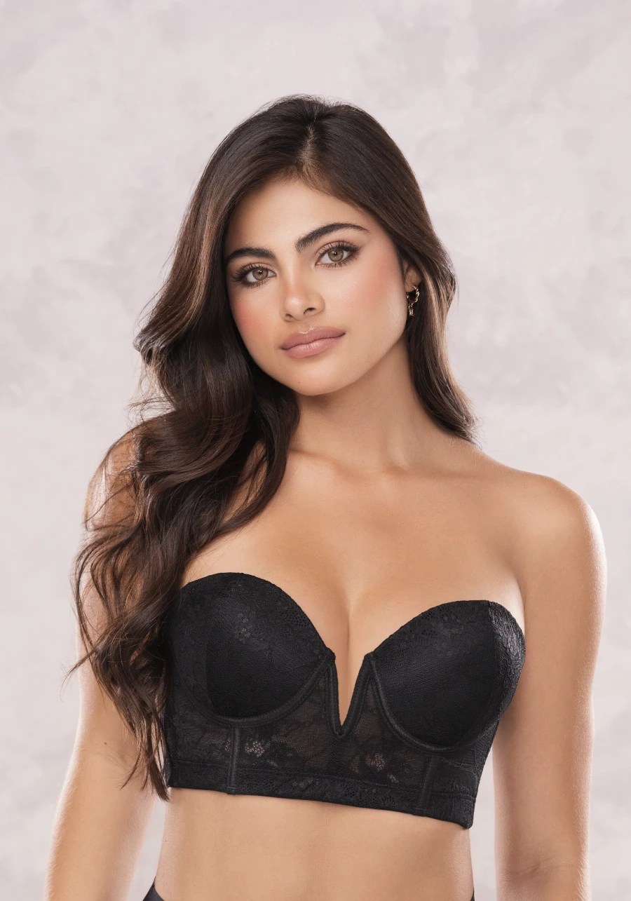 Brasier Strapless Negro, es un diseño en encaje de lujo con escote profundo y copa strapless que realza tu busto con una modelación impecable. Su elástico siliconado mantiene el brasier firme todo el día, mientras las varillas frontales y laterales, ubicadas estratégicamente para no sentirse, ofrecen soporte y definición perfecta.