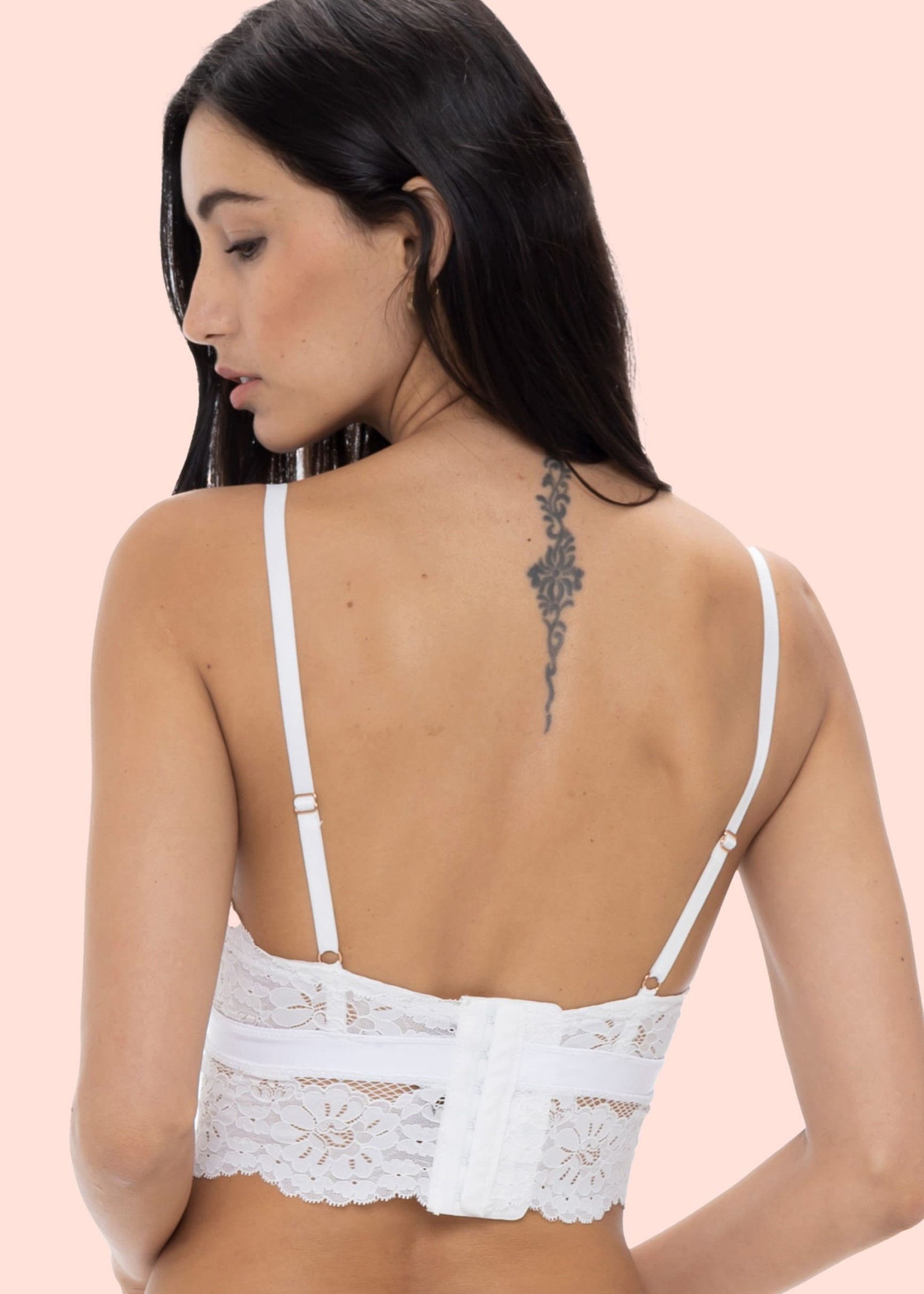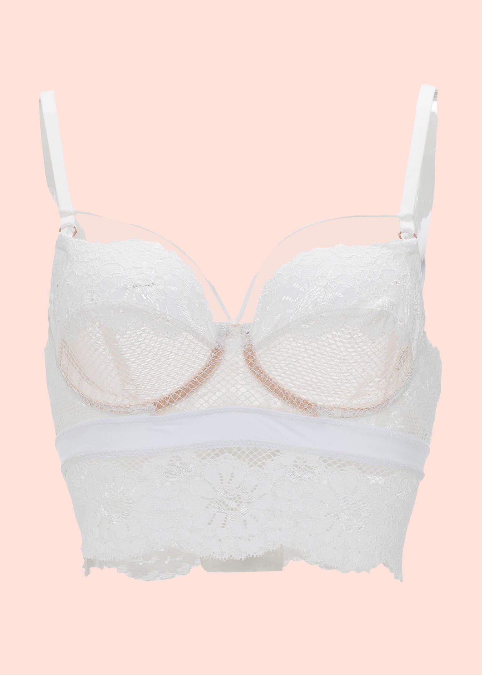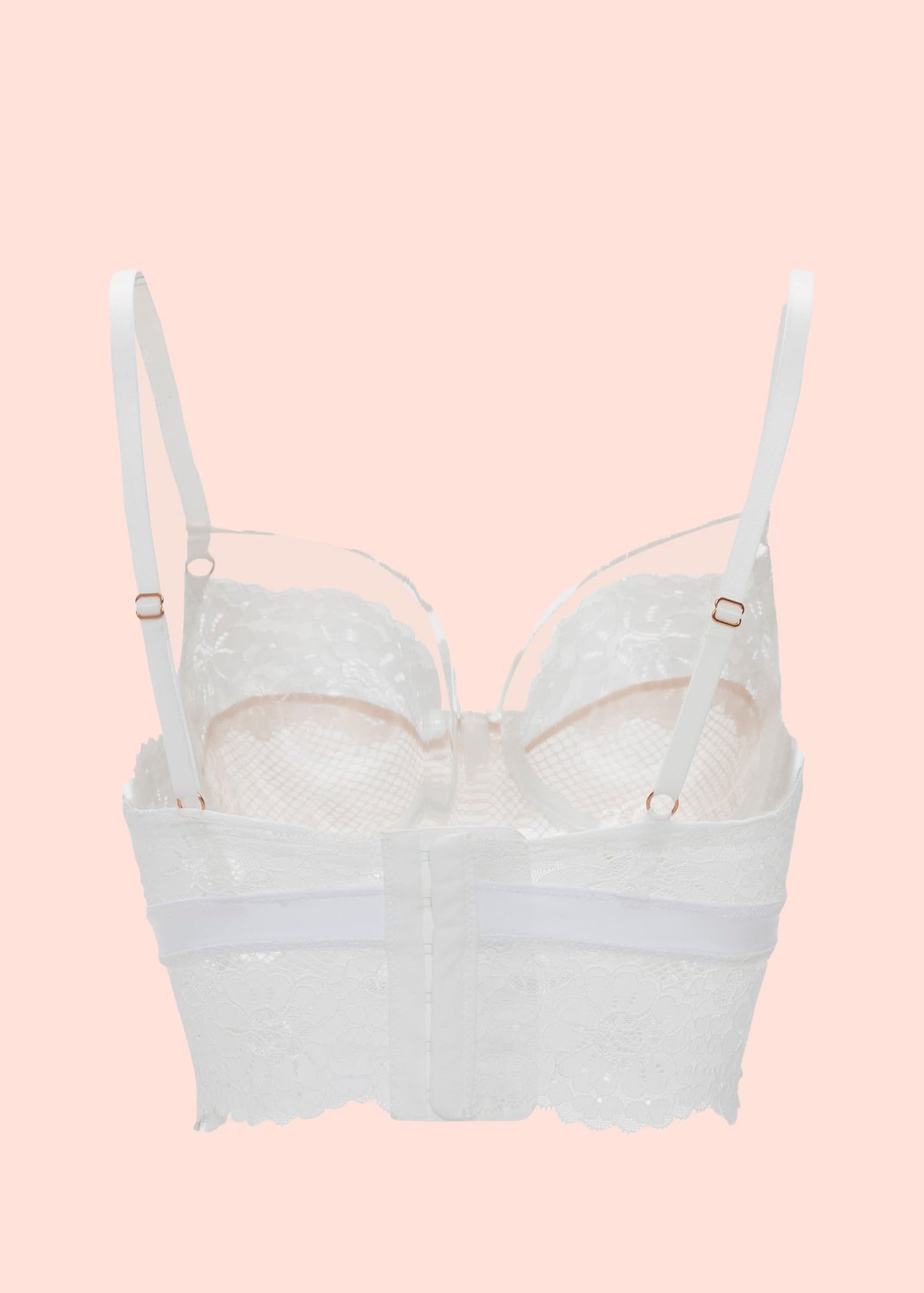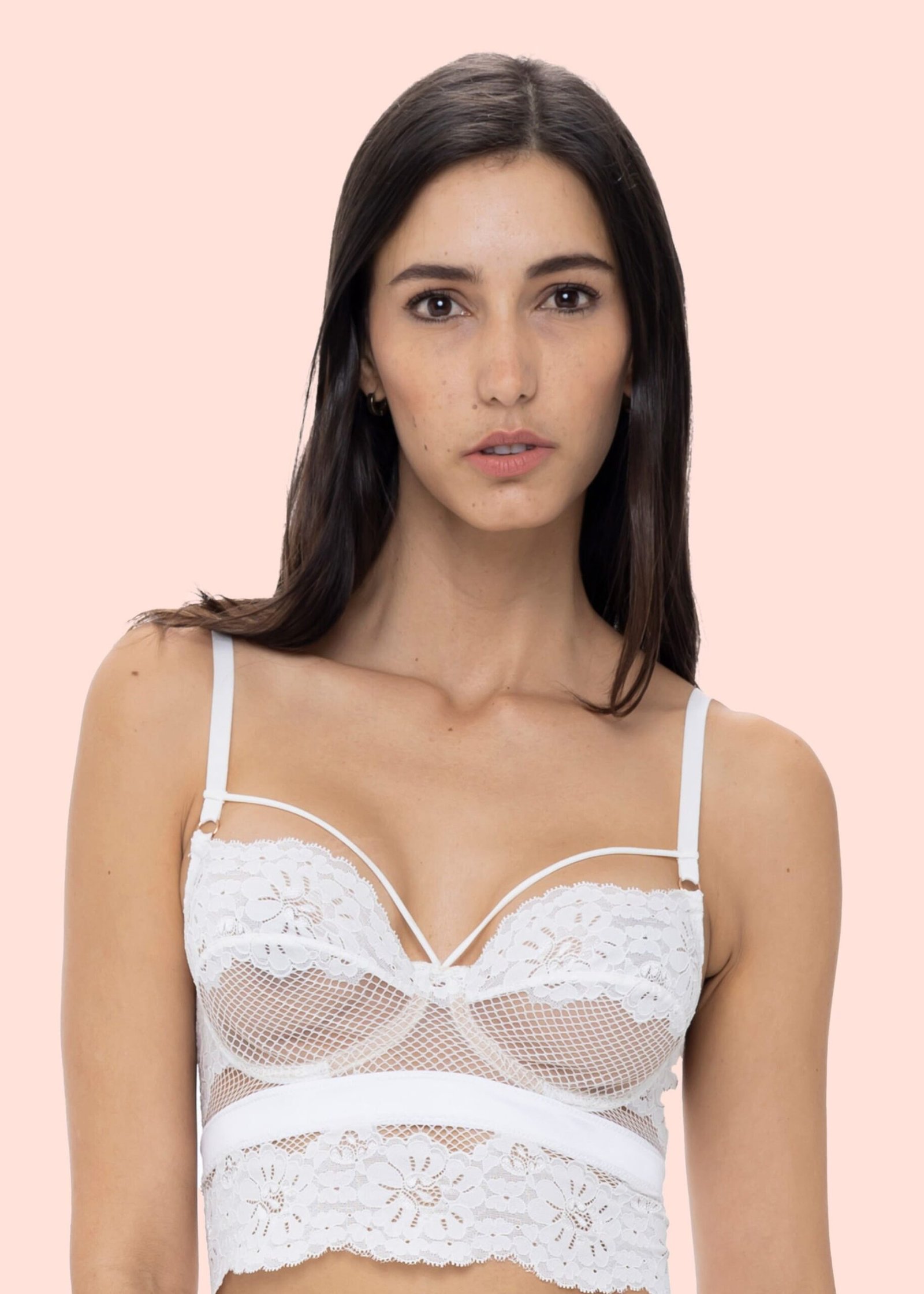 Elaborado en suave encaje europeo floral y de red. Tiene aro para el adecuado realce del busto y cargaderas regulables. Los tirantes en escote te harán lucir muy sensual.