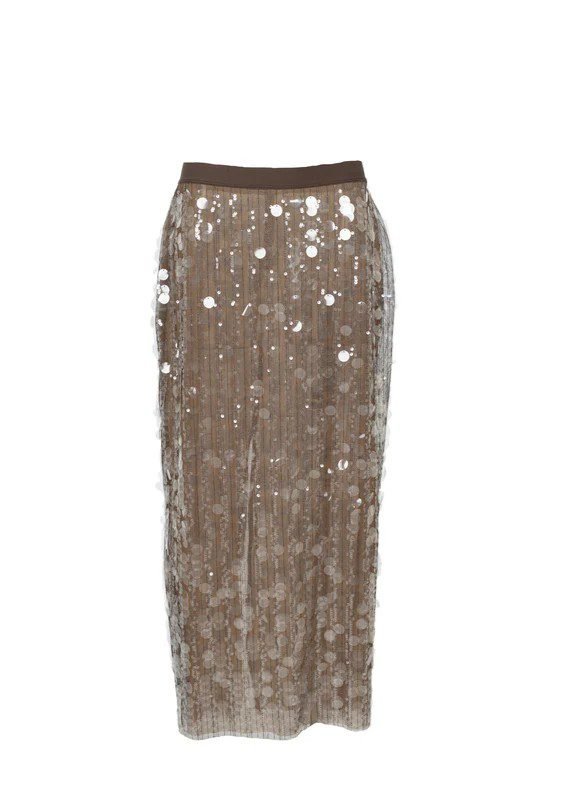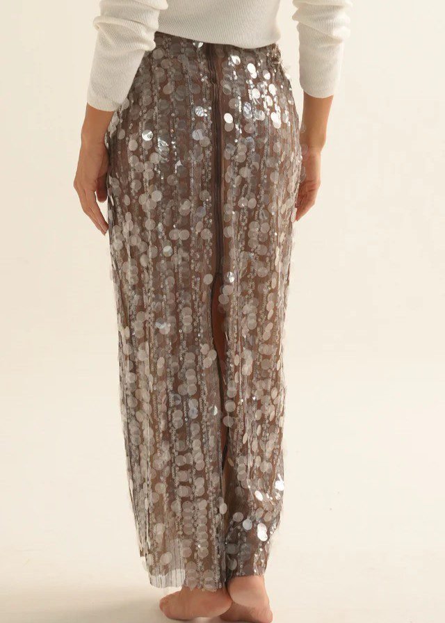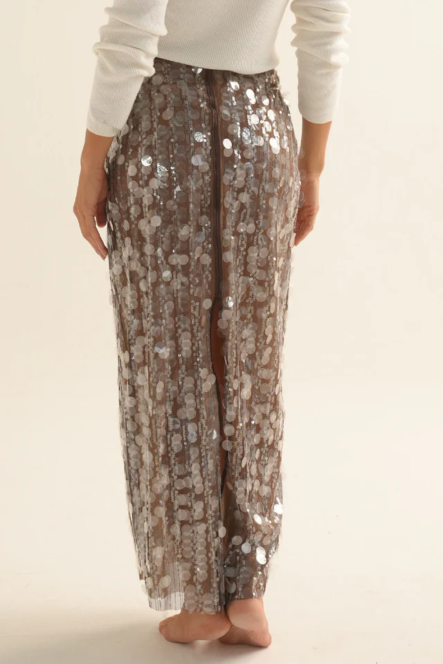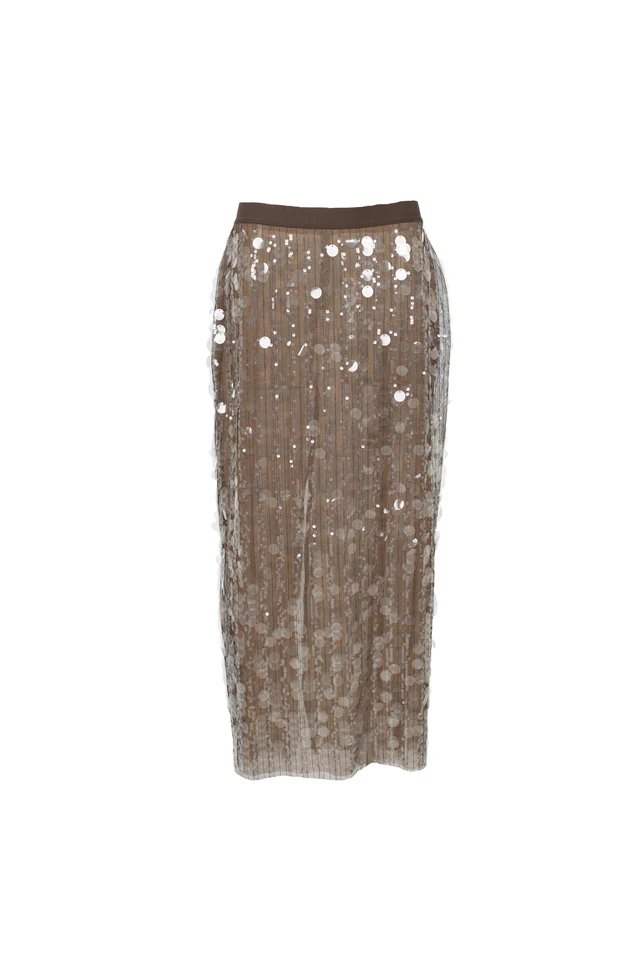 Falda de lentejuelas con caída elegante y movimiento sutil.