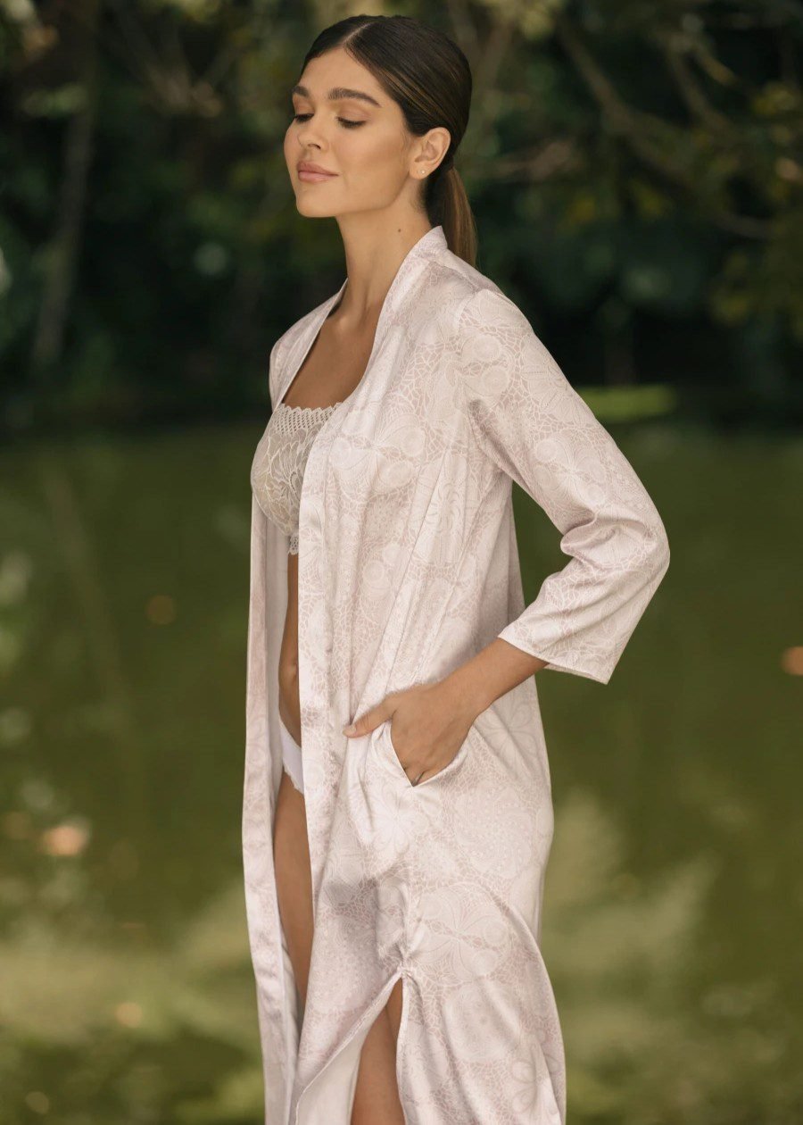 Kimono de largo midi estampado de silueta amplia, con mangas largas; delicado y romántico. El kimono trae su cinturón para lograr el amarre que mejor prefieras, además cuenta con bolsillos.