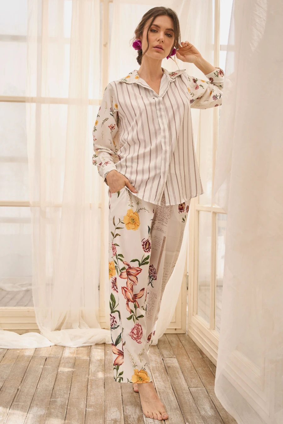 La Pijama Detalles  con estampado floral vintage y escritura romántica convierte cada movimiento en un gesto de estilo y libertad, confeccionado en tactos de seda natural muy suave con la piel.