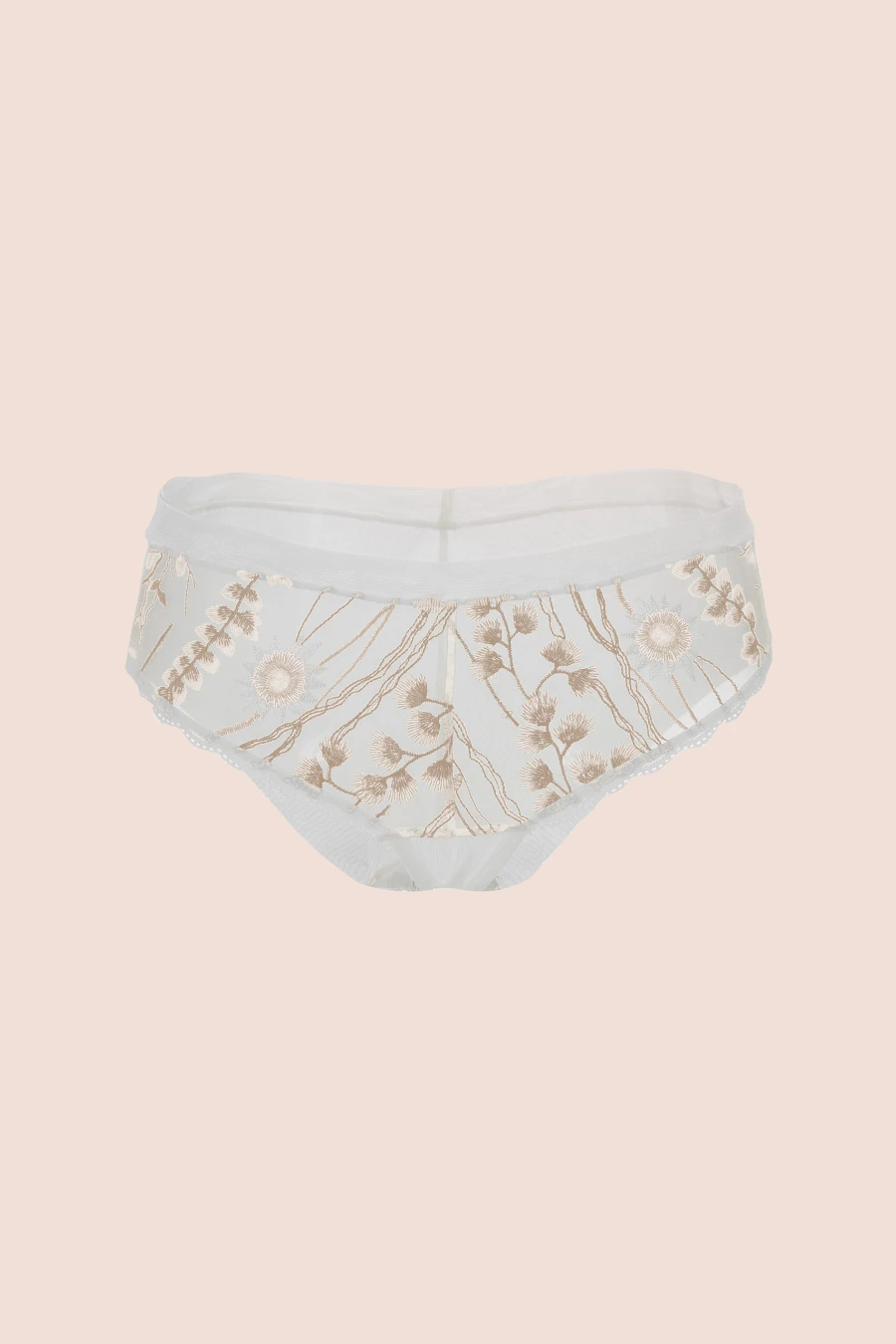 Panty de sutil bordado sobre delicado tul europeo. Tiene puntillas decorativas blancas en la cintura y en la entrepierna. El puente íntimo es 100% algodón para proteger tu zona íntima.