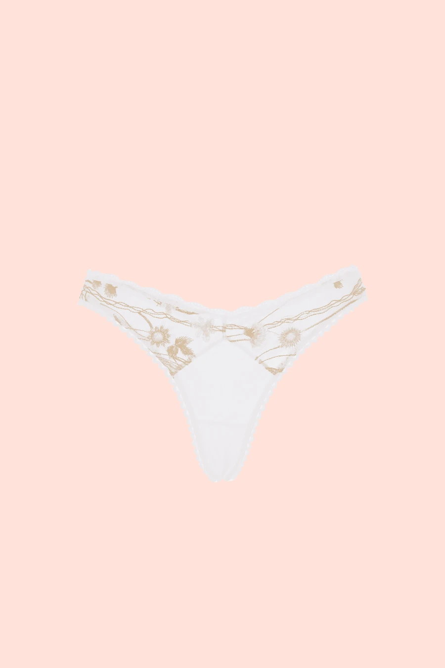 Panty de sutil bordado sobre delicado tul europeo. Tiene puntillas decorativas blancas en la cintura y en la entrepierna. El puente íntimo es 100% algodón para proteger tu zona íntima.