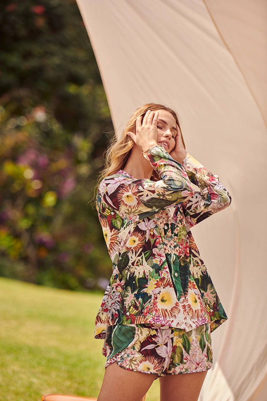 Short de pijama con estampado tropical, en tela liguera sin peso. Ideal para sentirte cómoda y fresca al momento de dormir.