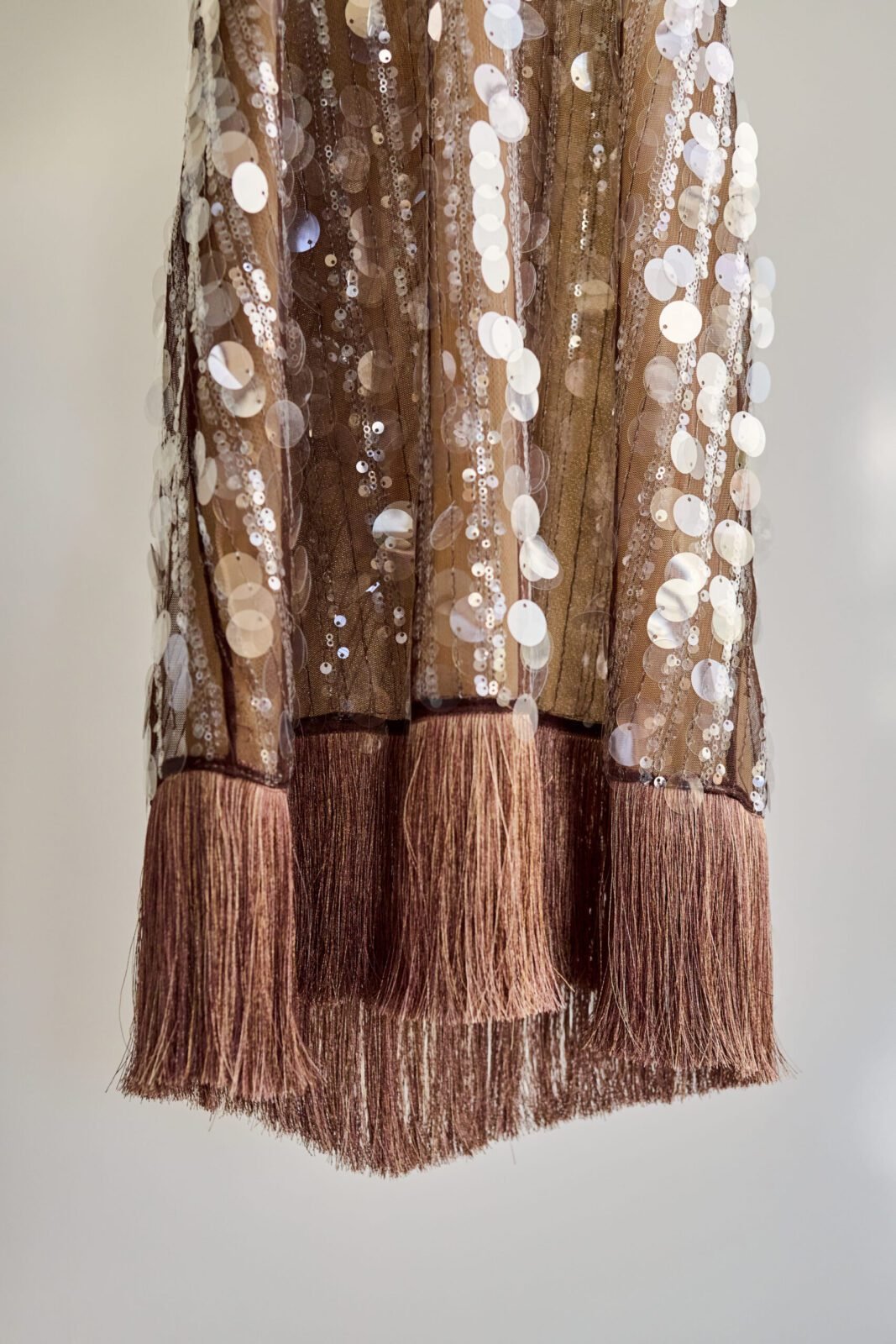 Vestido mini cafe plateado con escote halter, confeccionado en finas lentejuelas europeas, que capturan la luz y flecos de seda que aportan movimiento. Un diseño que equilibra glamour y elegancia moderna, pensado para destacar con seguridad y deslumbrar